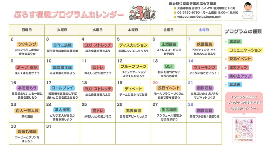 今月のプログラム予定表をアップしましたので